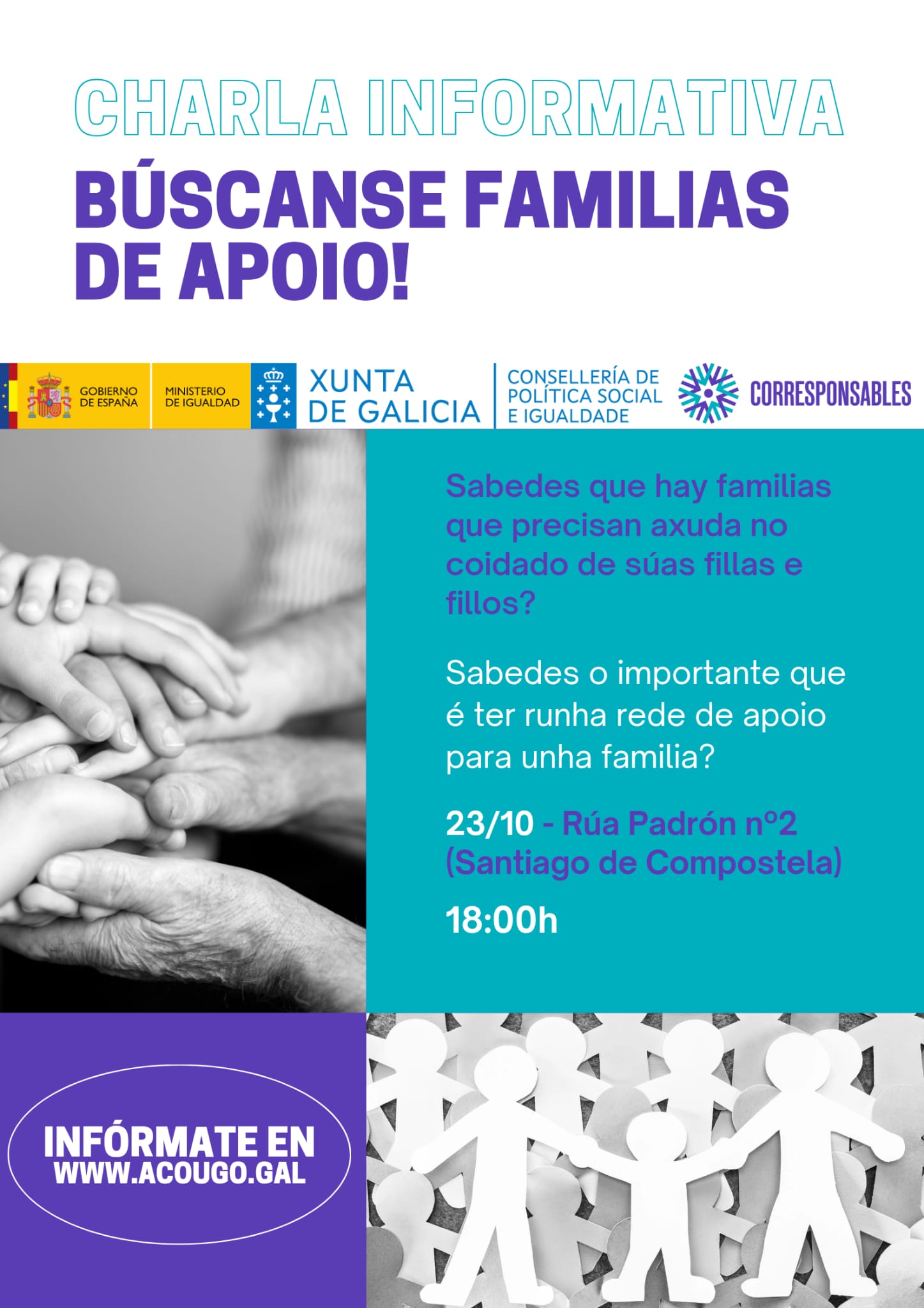 ACOUGO —Asociación Galega de Familias de Acollida— convídate a participar nunha charla informativa nas súas oficinas, centrada no programa FAMILIAS CORRESPONSABLES como ferramenta clave para garantir o benestar de nenos, nenas e adolescentes que non poden vivir coas súas familias de orixe. Durante esta xornada abordarase: